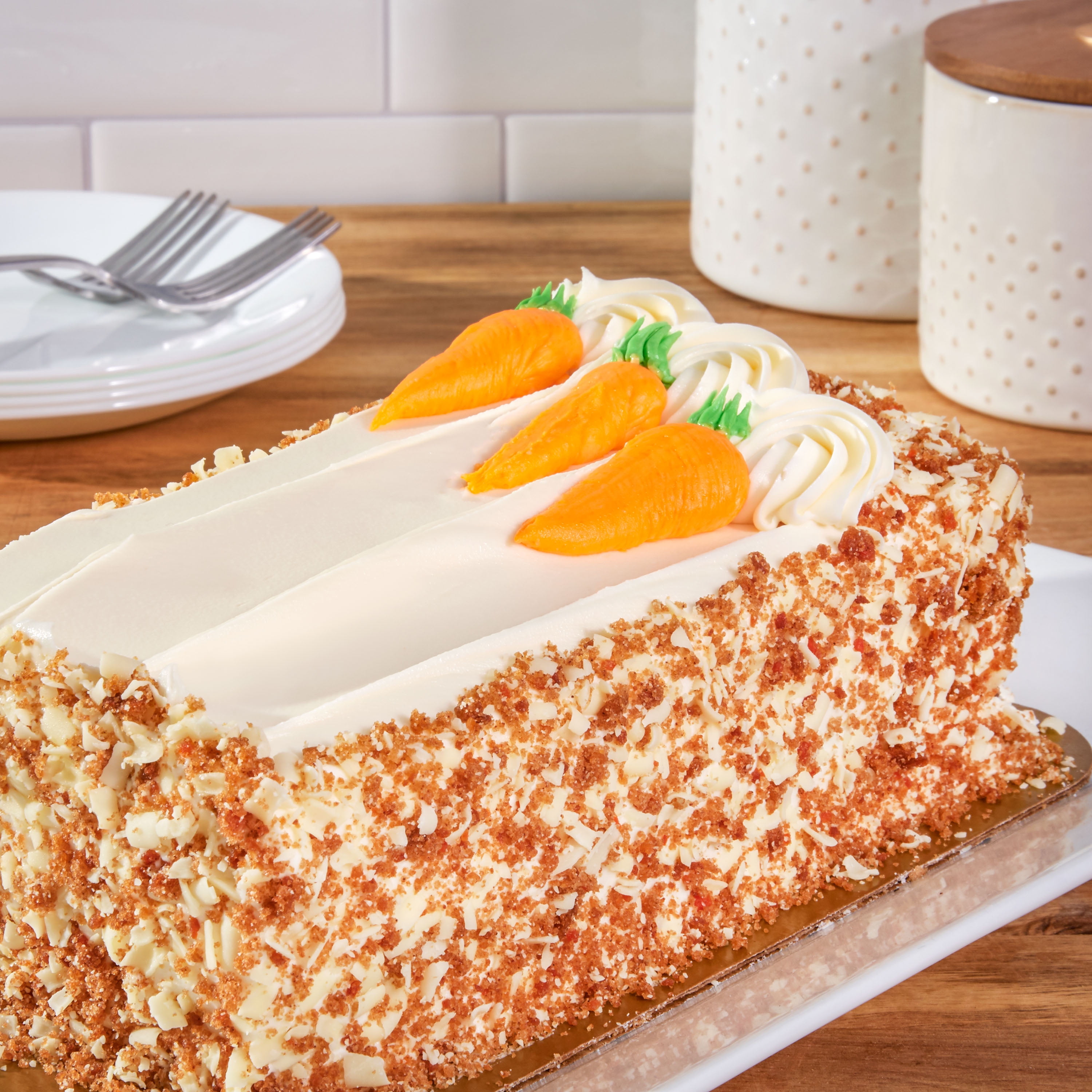 Sold shipped by. 30 25g Carbs. Our carrot cake has just the right amount of spices and is topped with a tasty cream cheese frosting as well as an adorable icing design of a carrot on top.